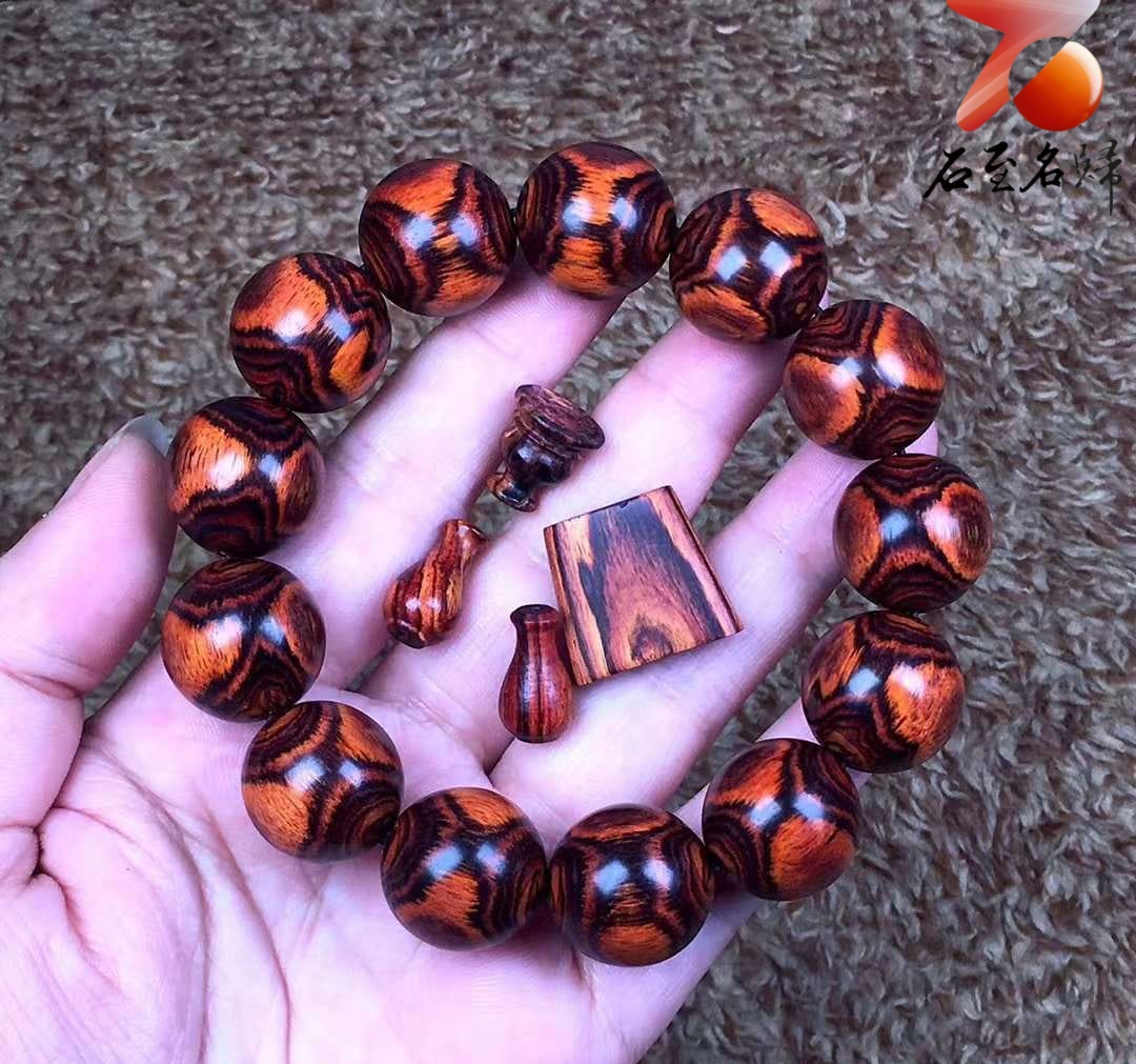 極品海南黃花梨野生料 虎皮X紋對眼鬼臉 19.2mm手珠