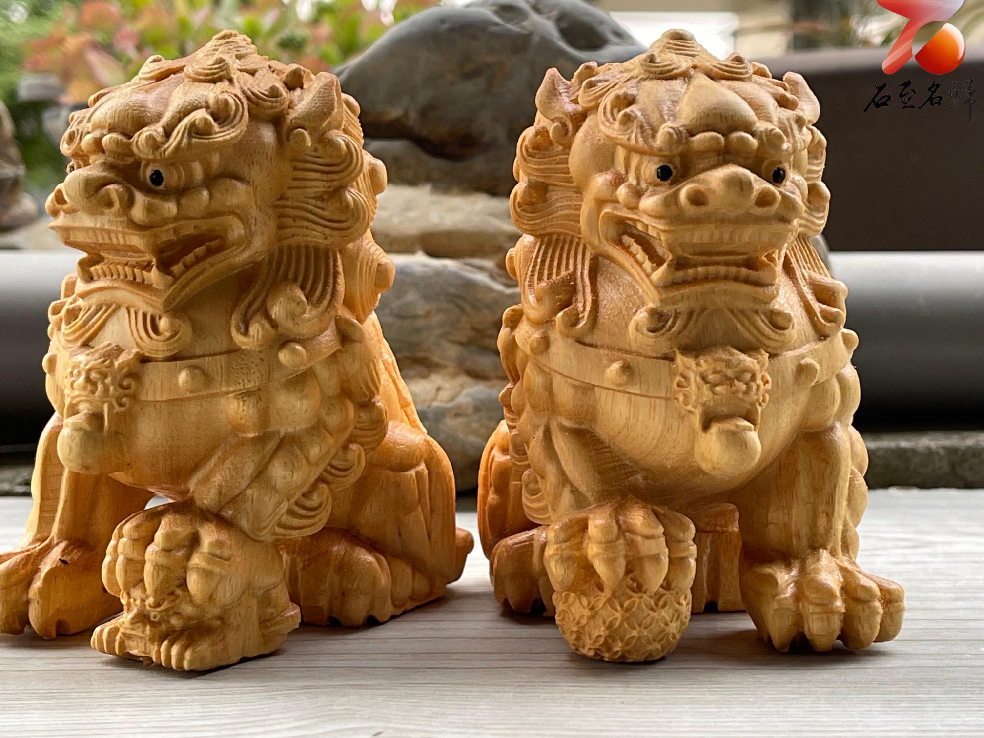 黃楊木整料雕刻 【陰陽合和,鎮宅招財之選】吉祥古獅對組 高6公分